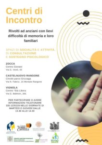 Gli spazi di consultazione e sostegno psicologico si realizzano nelle medesime sedi dei centri d’incontro a Zocca, Castelnuovo Rangone e Vignola.